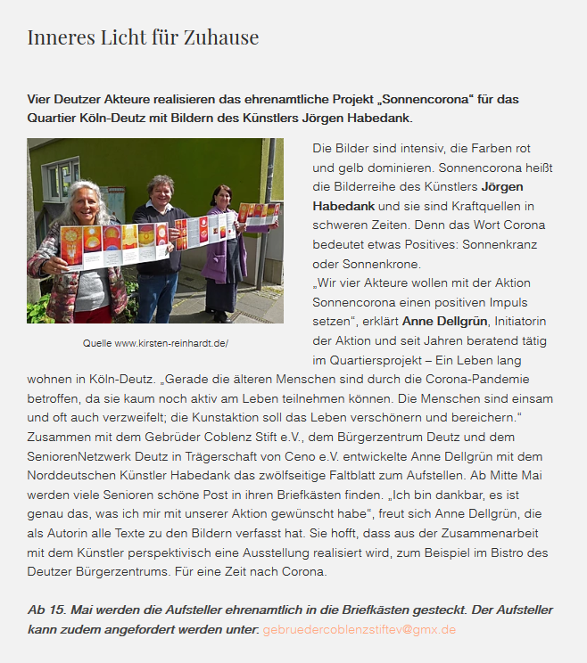 „Wir vier Akteure wollen mit der Aktion Sonnencorona einen positiven Impuls setzen“, erklärt Anne Dellgrün, WBC-Mitgglied und Initiatorin der Aktion. Die Autorin und Beraterin ist seit Jahren tätig im Quartiersprojekt – Ein Leben lang wohnen in Köln-Deutz. „Gerade die älteren Menschen sind durch die Corona-Pandemie betroffen, da sie kaum noch aktiv am Leben teilnehmen können. Die Menschen sind einsam und oft auch verzweifelt; die Kunstaktion soll das Leben verschönern und bereichern.“ Zusammen mit dem Gebrüder Coblenz Stift e.V., dem Bürgerzentrum Deutz und dem SeniorenNetzwerk Deutz in Trägerschaft von Ceno e.V. entwickelte Anne Dellgrün mit dem Norddeutschen Künstler Habedank das zwölfseitige Faltblatt zum Aufstellen. Ab Mitte Mai werden viele Senioren schöne Post in ihren Briefkästen finden. „Ich bin dankbar, es ist genau das, was ich mir mit unserer Aktion gewünscht habe“, freut sich Anne Dellgrün, die als Autorin alle Texte zu den Bildern verfasst hat. Sie hofft, dass aus der Zusammenarbeit mit dem Künstler perspektivisch eine Ausstellung realisiert wird, zum Beispiel im Bistro des Deutzer Bürgerzentrums. Für eine Zeit nach Corona.