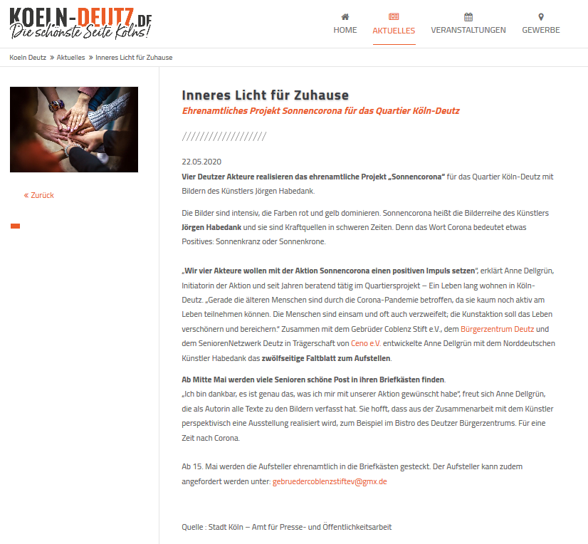 Mai 2020: Initiatorin Anne Dellgrün realisierte zusammen mit drei Deutzer Akteuren das ehrenamtliche Projekt „Sonnencorona“ für das Quartier Köln-Deutz mit Bildern des Künstlers Jörgen Habedank. Zahlreiche Medien berichteten.